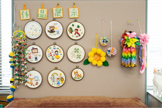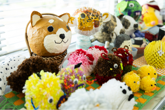 革細工、手芸(刺しゅう、編み物)、絵画(塗り絵、切り絵、自由画)、折り紙、書道、ペン字、パズル、プラモデル、各種機能訓練 など。生活リズムの改善、集中力の向上、認知機能の向上、情緒の安定などを目指します。
