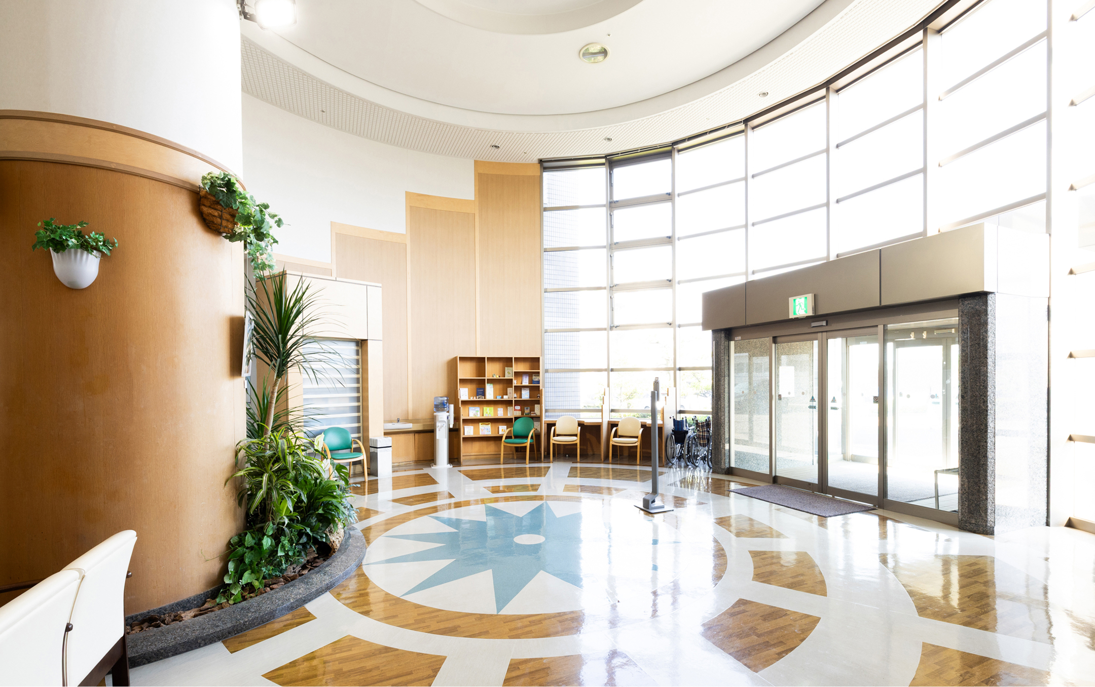 高い天井のエントランスの中心に観葉植物をディスプレイするなど、癒しの環境づくりに取り組んでおります。